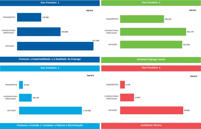 Os pagamentos situavam-se em 488M€ sendo que 478M€ decorrem do Fundo Social Europeu (FSE).